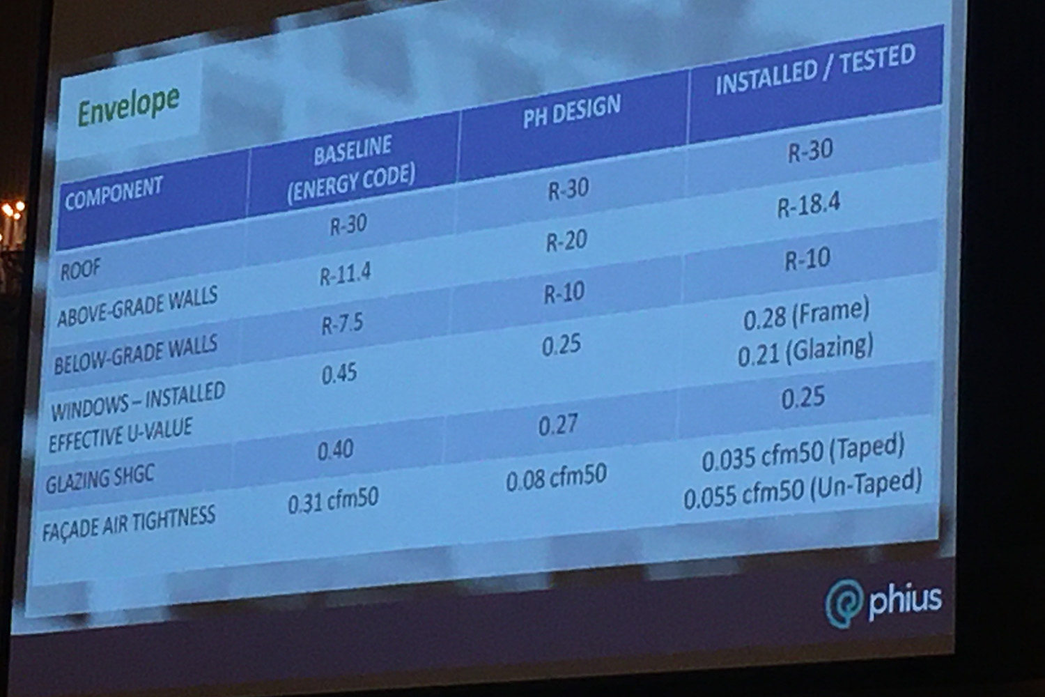 This first photo from the presentation about the building’s development shows that while the building specs aren’t significantly above code, the air tightness is.