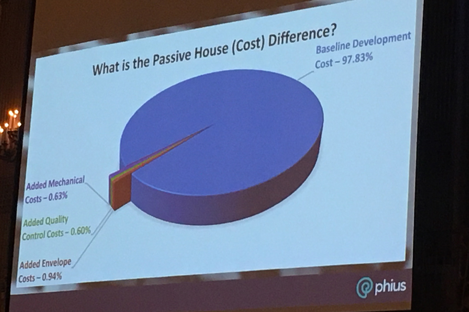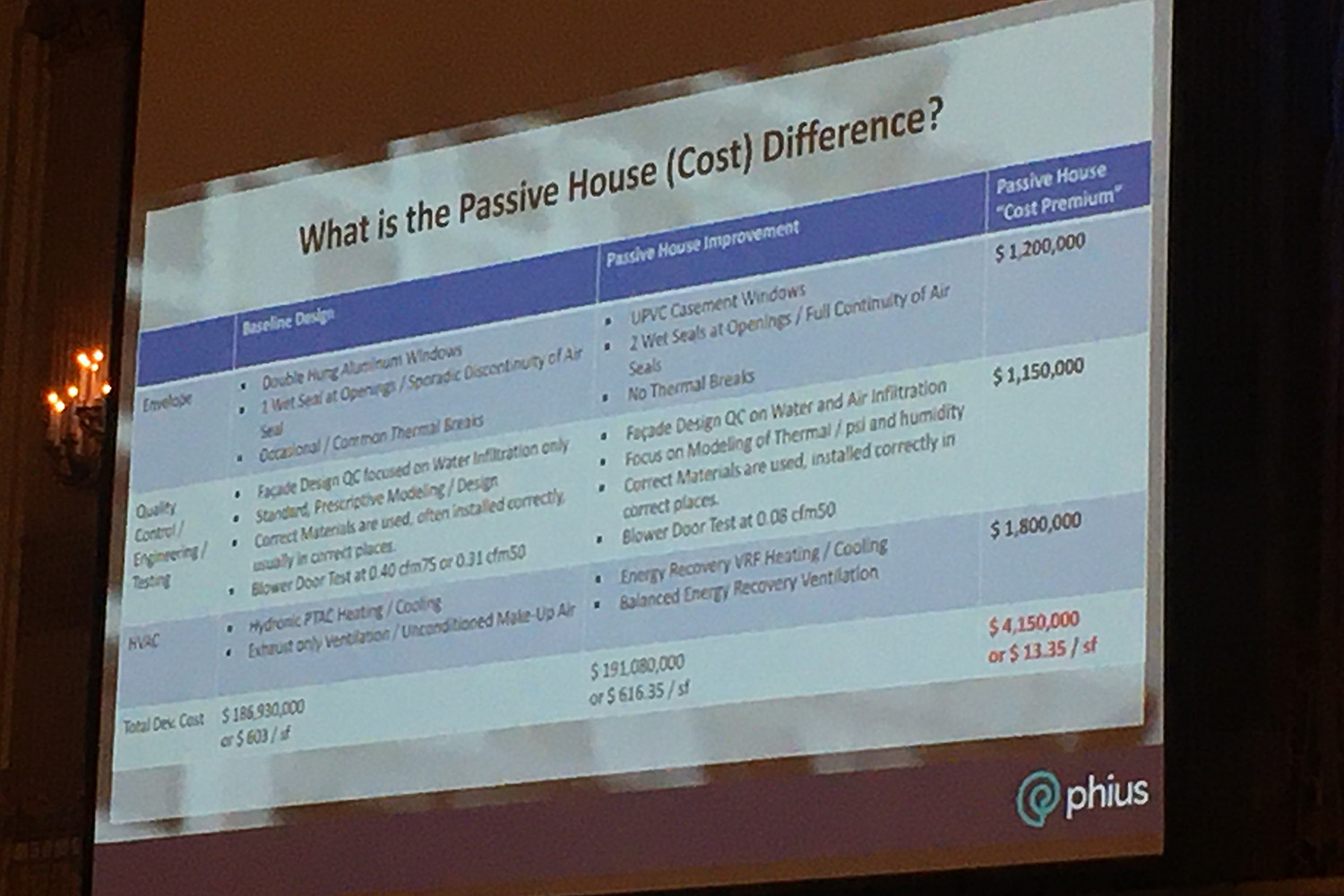 In this next slide on the left, they break down the premium for costs of developing to the Phius standard over code which comes to $4,150,000 or $13.35 per square foot. Not a small amount of money.