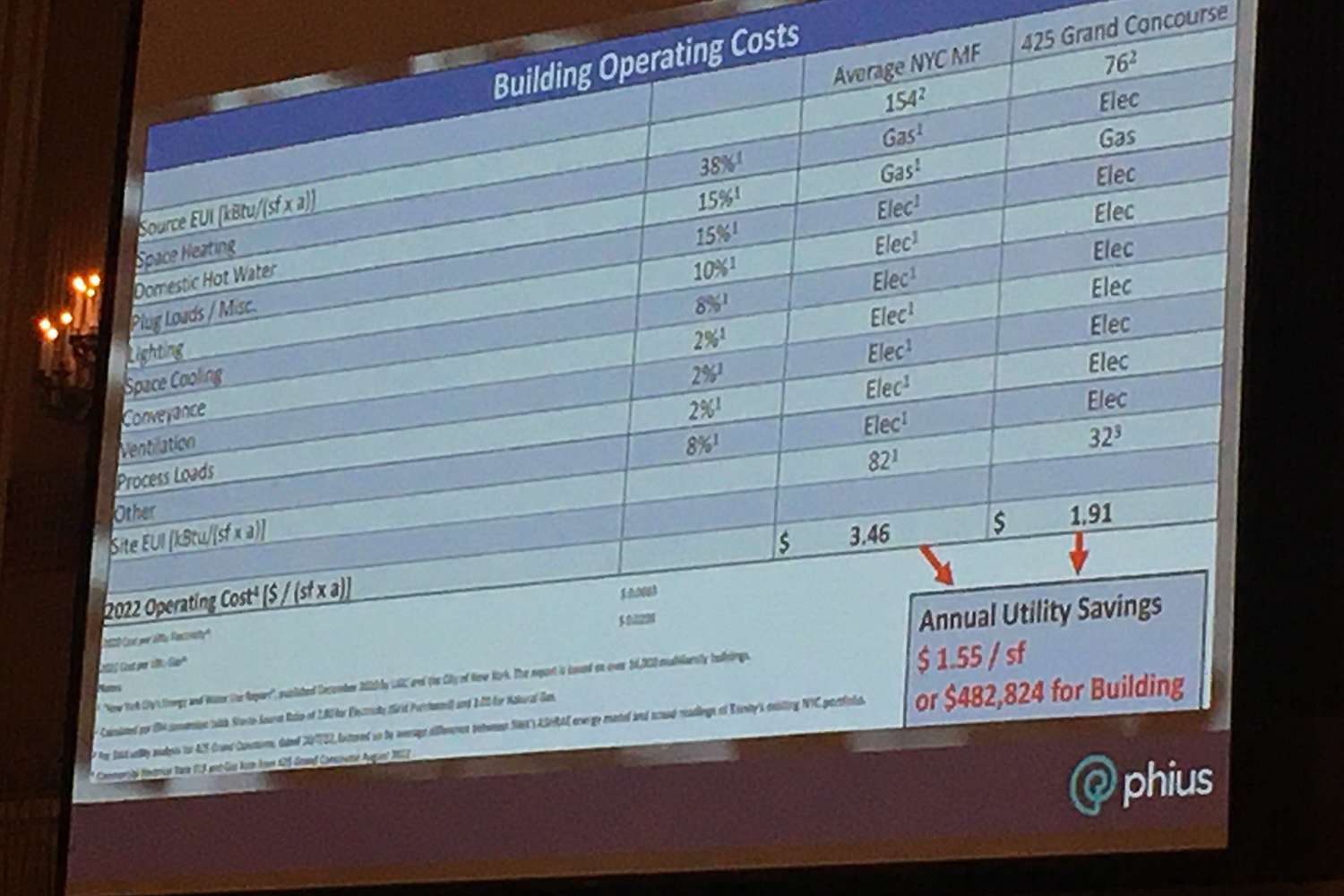 The following slide on the right then shows the operating costs for 425 Grand Concourse and how they would compare to a building that was built to baseline developement standards. The operating costs come to $1.55 per square foot or $482,824 for the entire building for the year versus the $3.46 per square foot of a standard built development.